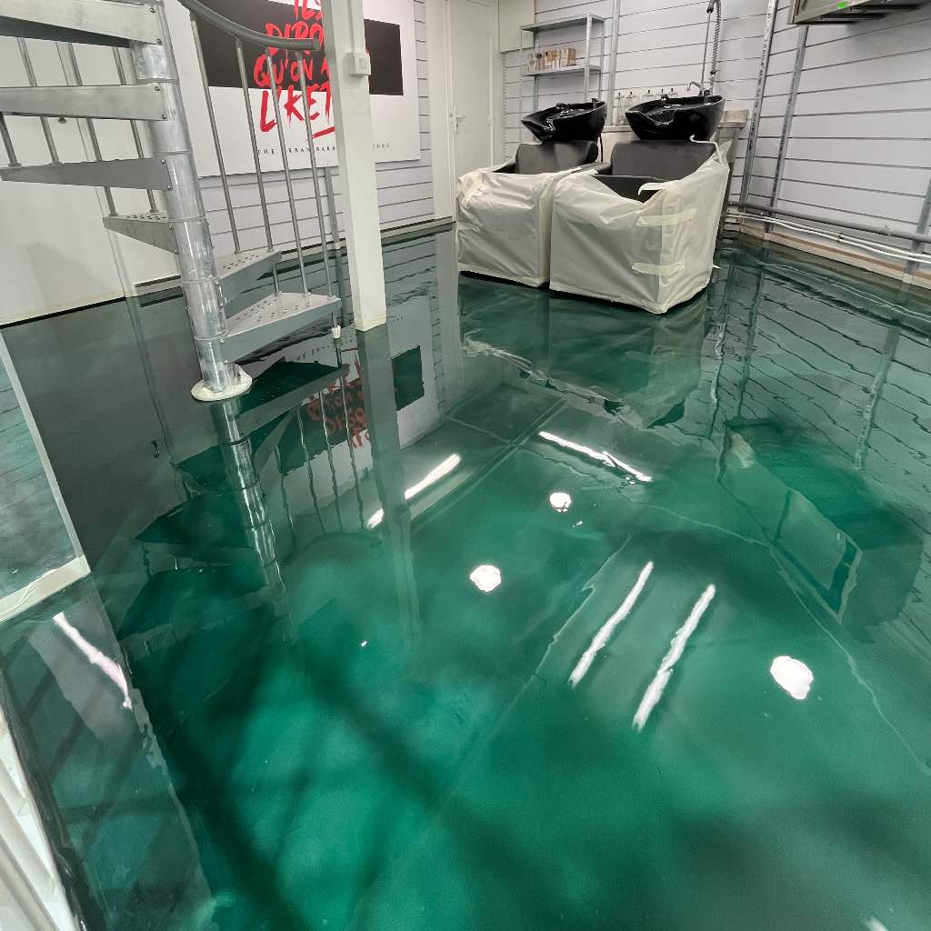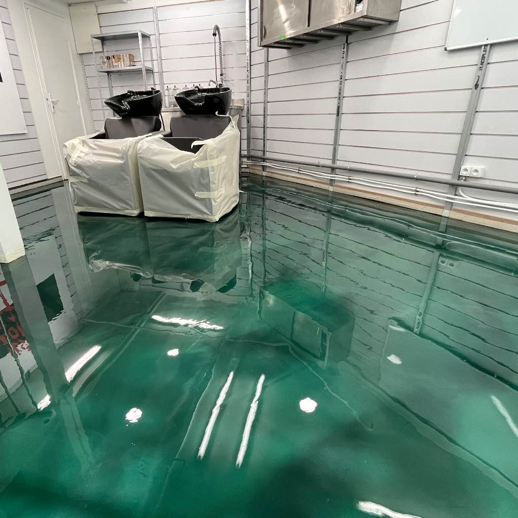 Pour ce projet, nous avons réalisé un sol en résine époxy vert nacré, apportant une touche d’élégance et de modernité à ce barber shop.